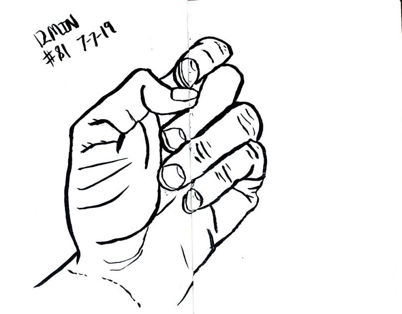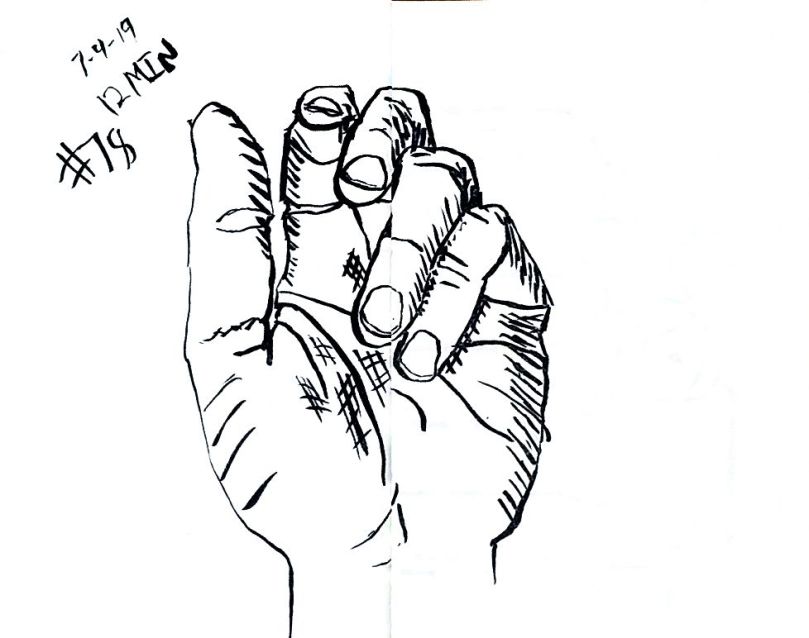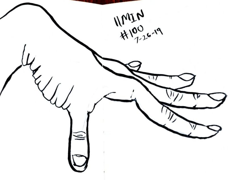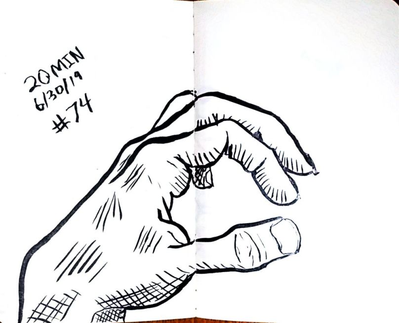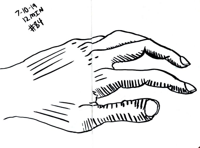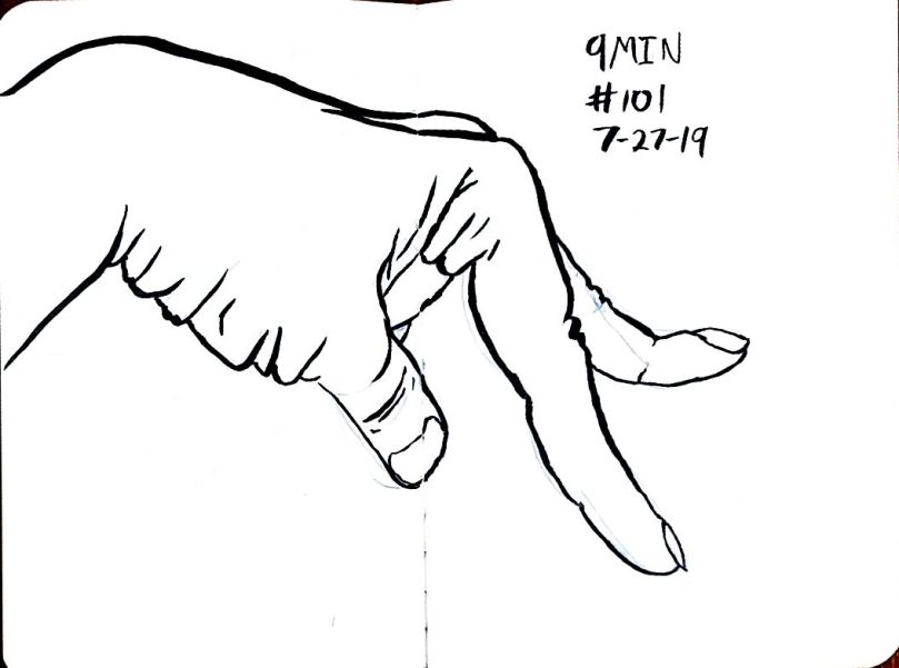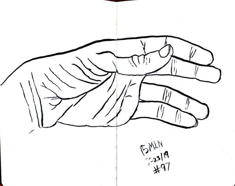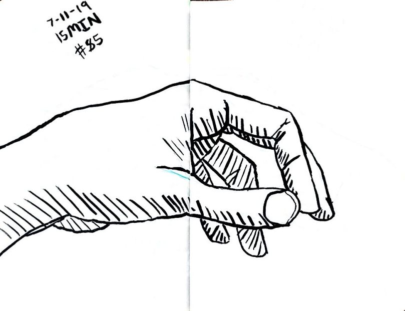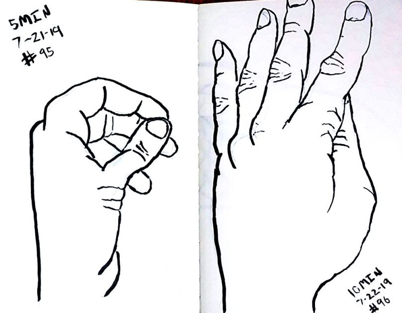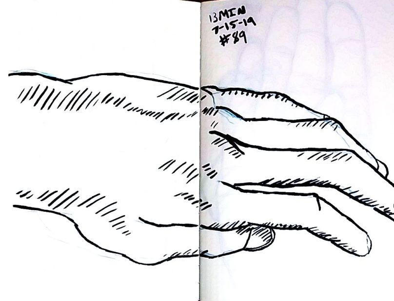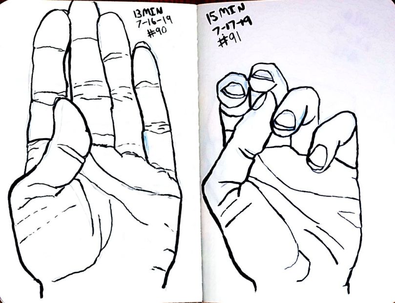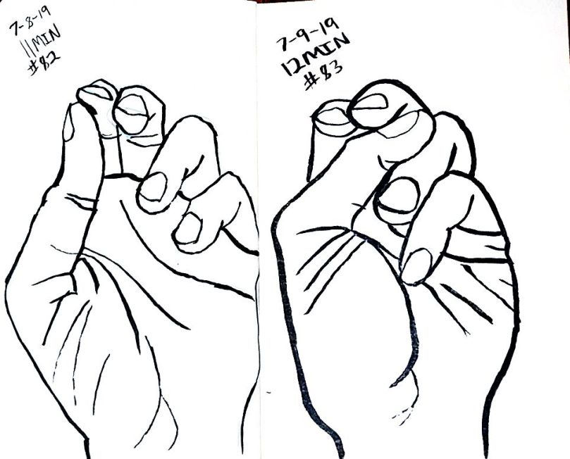 Also starting with 80 I used a dollar fifty 3.5 by 5 inch craft paper cover notebook. I really like that size. It’s a nice size. And they’re thin so I can clip then to a table and not have to worry about not having anything to steady it all. As of 101 I’m not quite halfway through the second little book. 101 and maybe 10 minutes a pice that’s a double just drawing a left hand. 16 hours. Not all that long really.