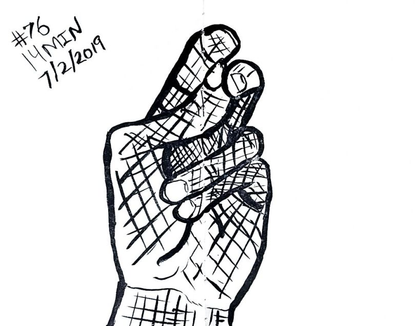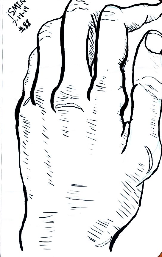 So here’s days 67 through to 101 of taking 15 minutes or so to draw my left hand. If you’re clever you can tell what day’s I took the stuff for that benign tremor. Maybe not though, if I hold the pencil loose enough it’s not that bad anyway. Starting on day 80 I went in with a pencil just cause I wanted to sort of get a process down. Pencil, then ink, then count. 1, 2, 3. Always 3. Speaking of which, hands are a 3 now, funny how that works out.