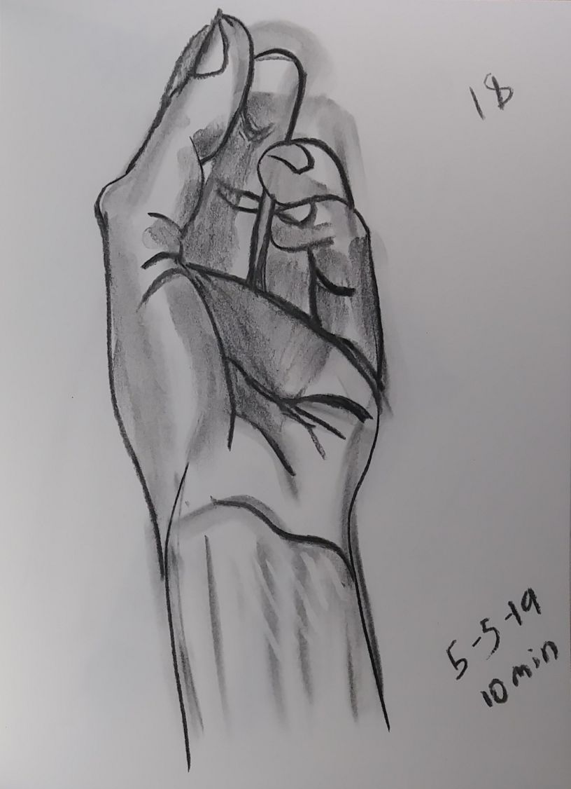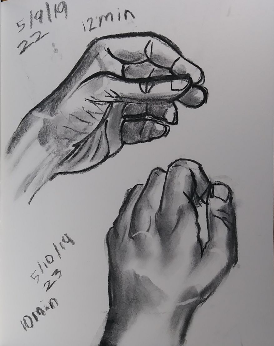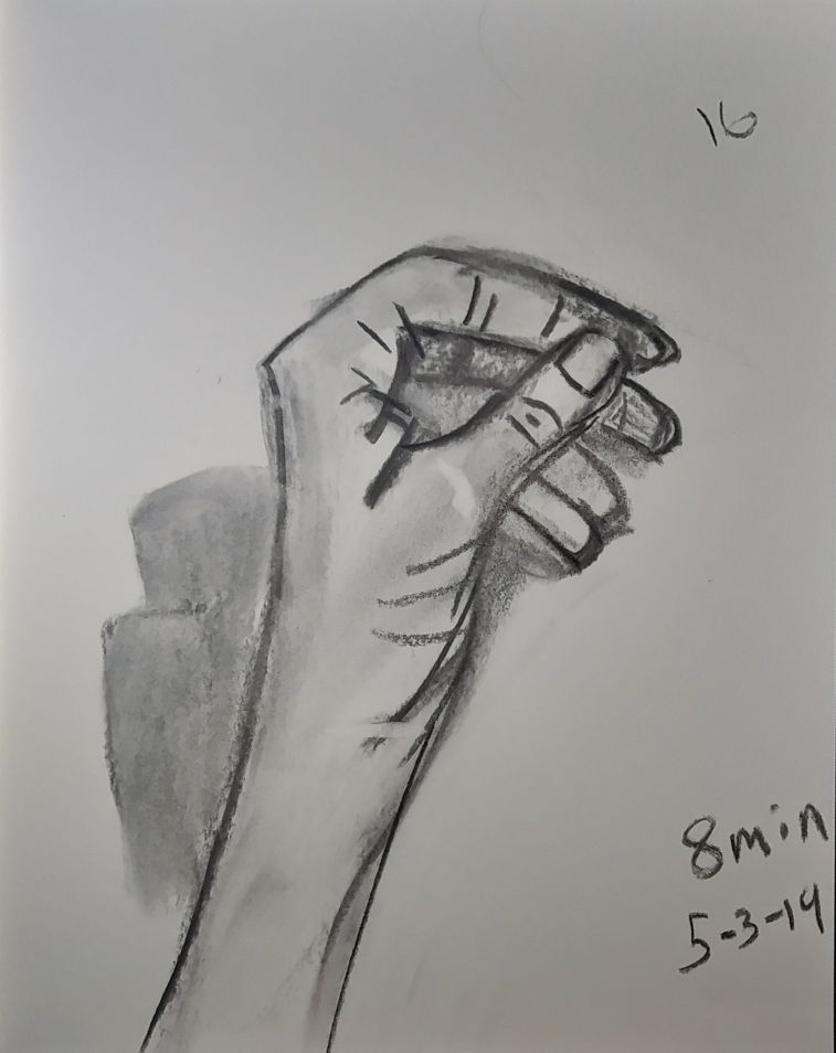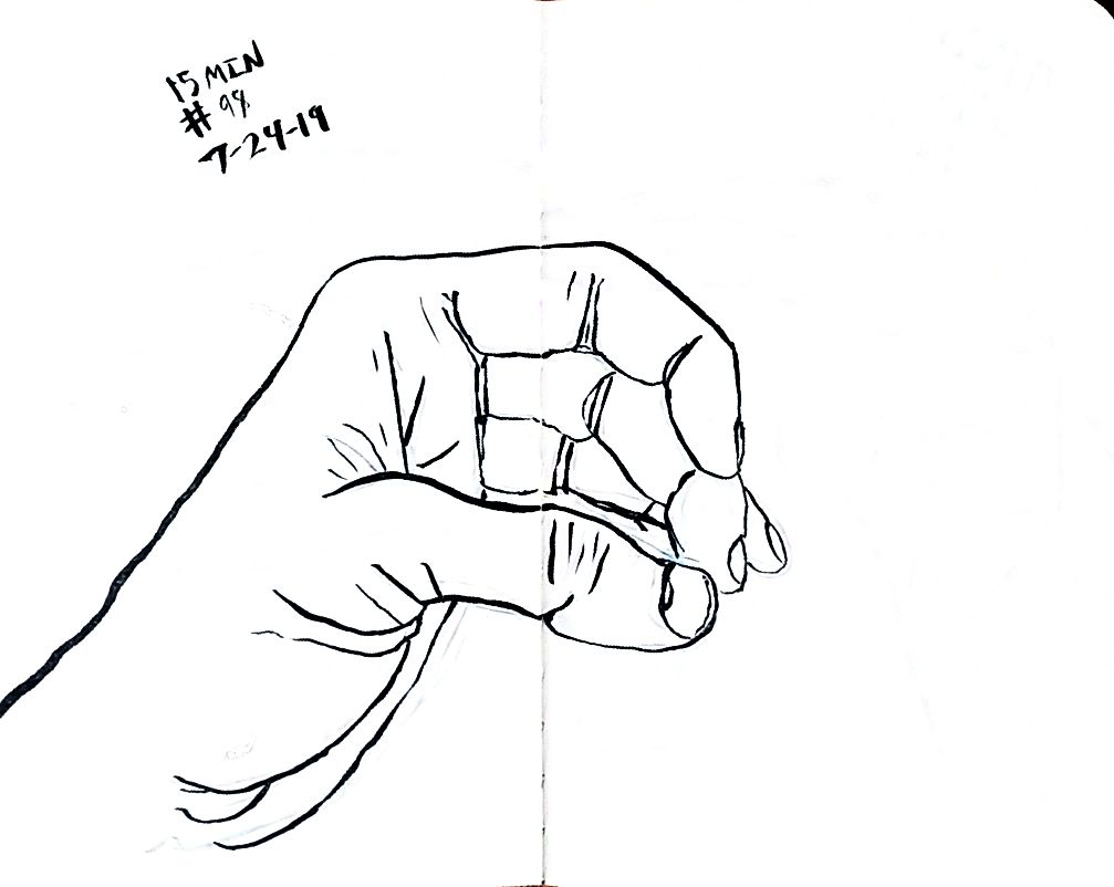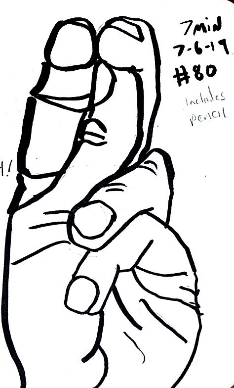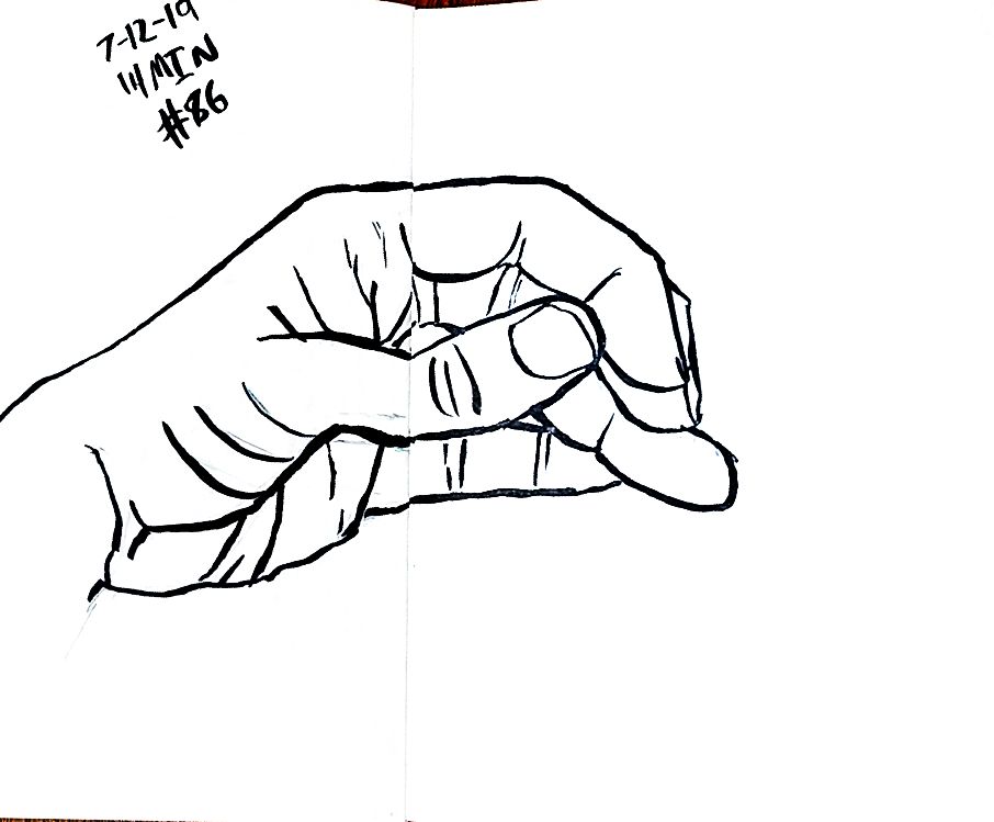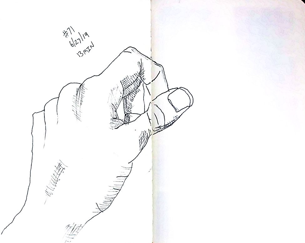 Also starting with 80 I used a dollar fifty 3.5 by 5 inch craft paper cover notebook. I really like that size. It’s a nice size. And they’re thin so I can clip then to a table and not have to worry about not having anything to steady it all. As of 101 I’m not quite halfway through the second little book. 101 and maybe 10 minutes a pice that’s a double just drawing a left hand. 16 hours. Not all that long really.