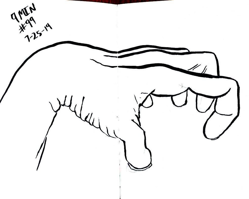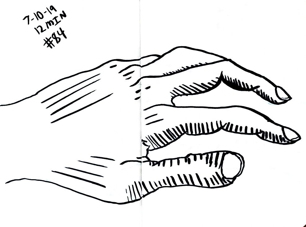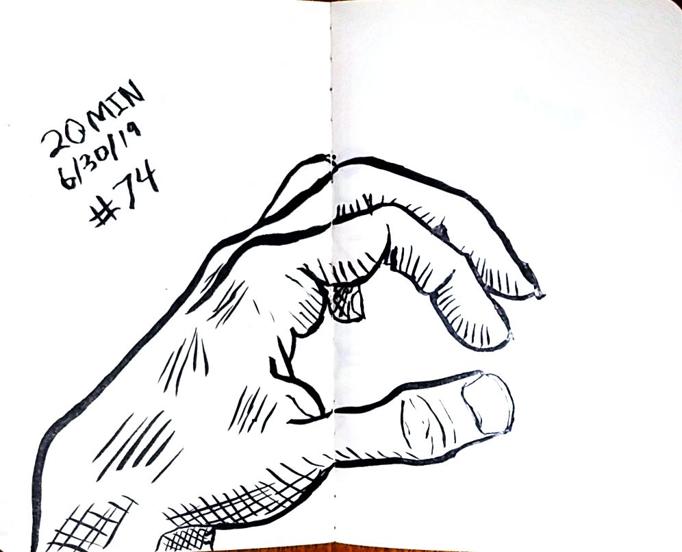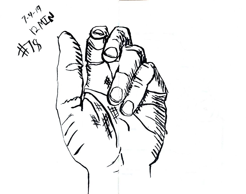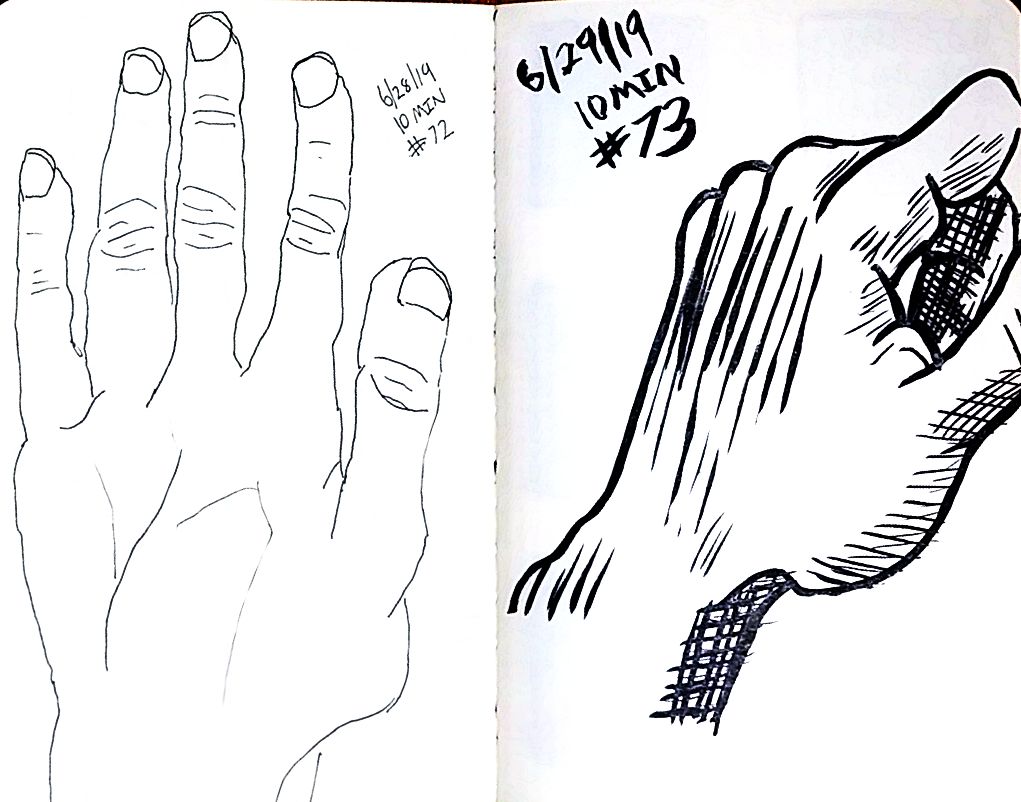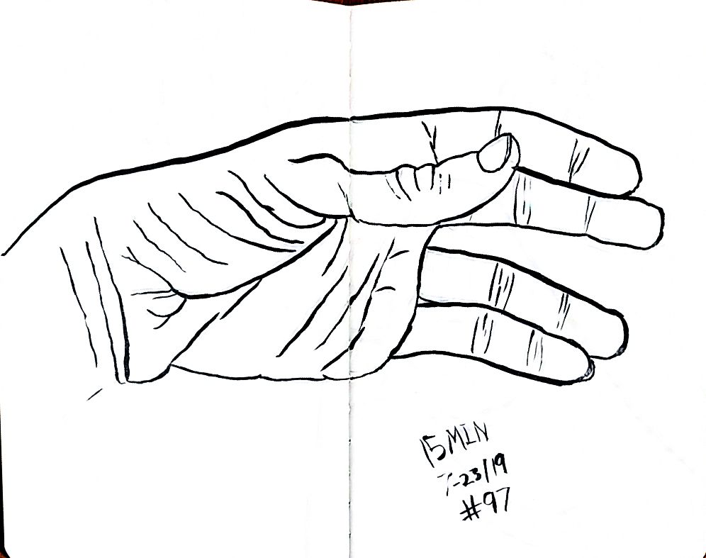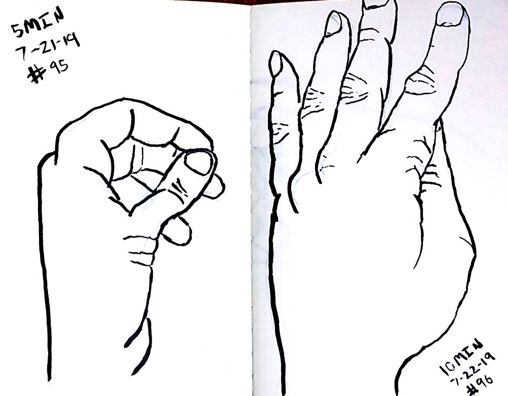 So line variation is more noticeable than I’d expect. That’s the thing about technical pens though, there is not variation without changing pens, that feels like something useful. Like maybe if I was trying for better work with perspective then lines up close could be thick and thin lines far away, would that make there feel like more or less depth on the page? Something I should probably learn about, but I’m really struggling with what’s real right now so maybe I better let that wait. Anyway here’s more left hands, and American Sign Language in around 10 minutes a hand, once a day.