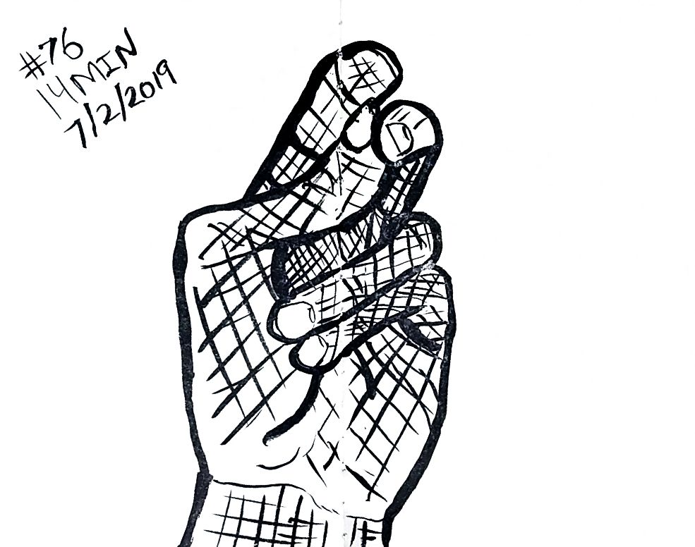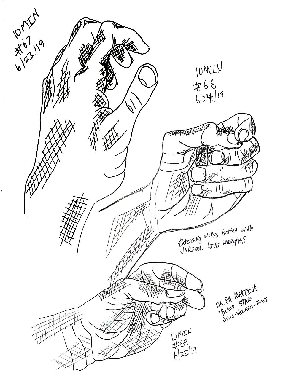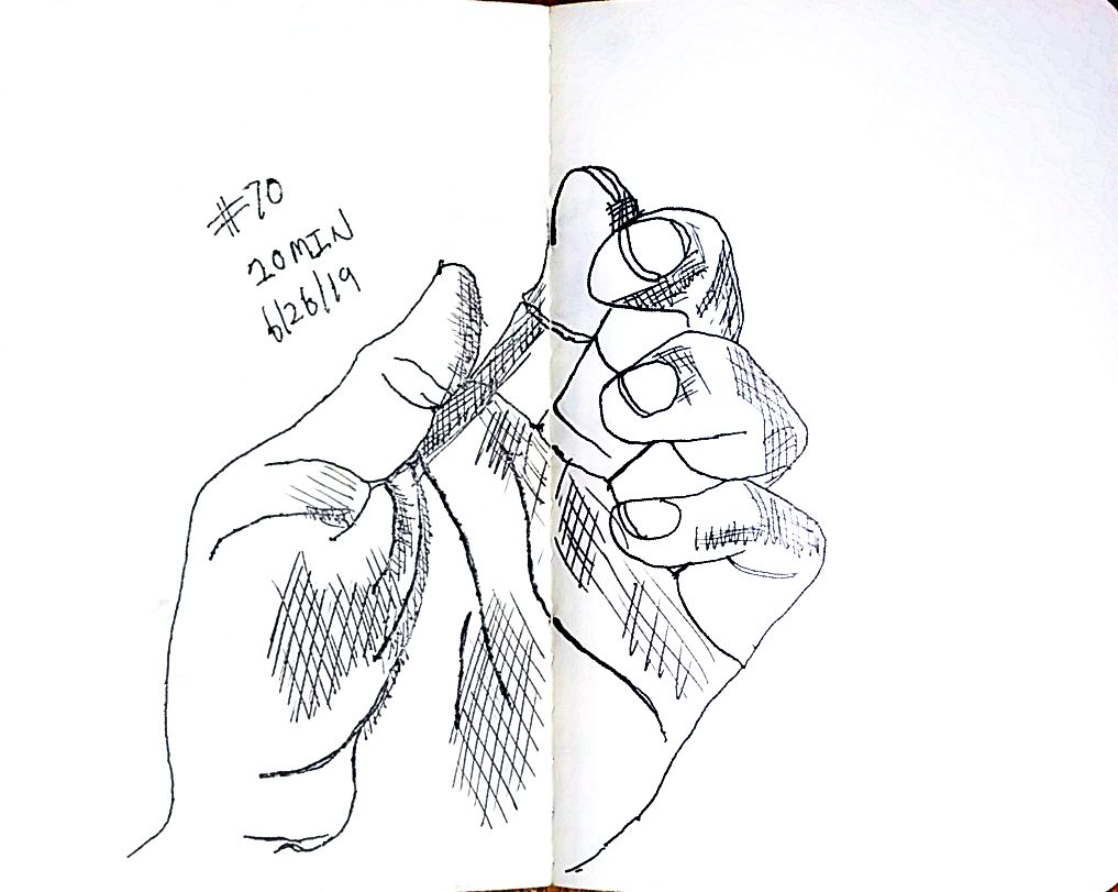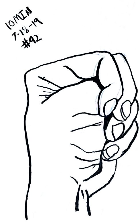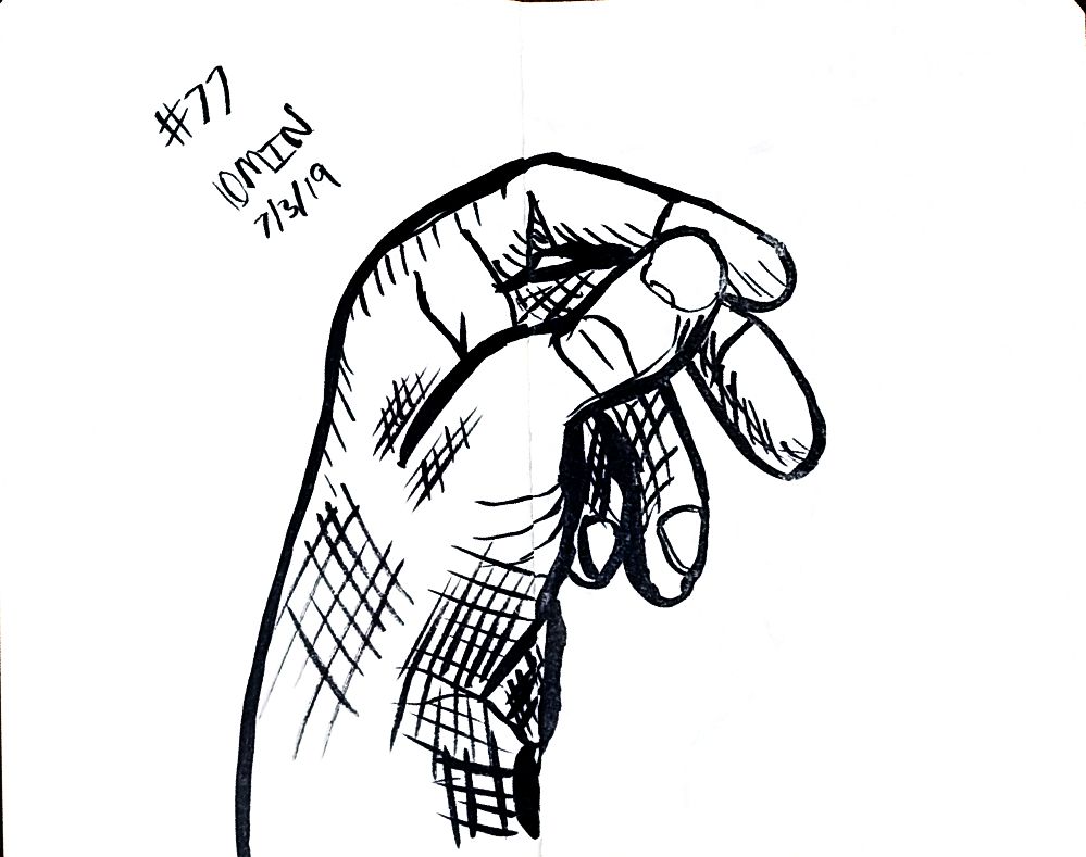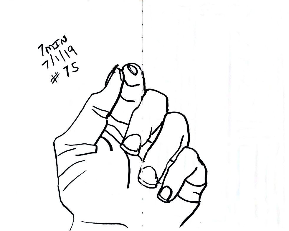 So line variation is more noticeable than I’d expect. That’s the thing about technical pens though, there is not variation without changing pens, that feels like something useful. Like maybe if I was trying for better work with perspective then lines up close could be thick and thin lines far away, would that make there feel like more or less depth on the page? Something I should probably learn about, but I’m really struggling with what’s real right now so maybe I better let that wait. Anyway here’s more left hands, and American Sign Language in around 10 minutes a hand, once a day.